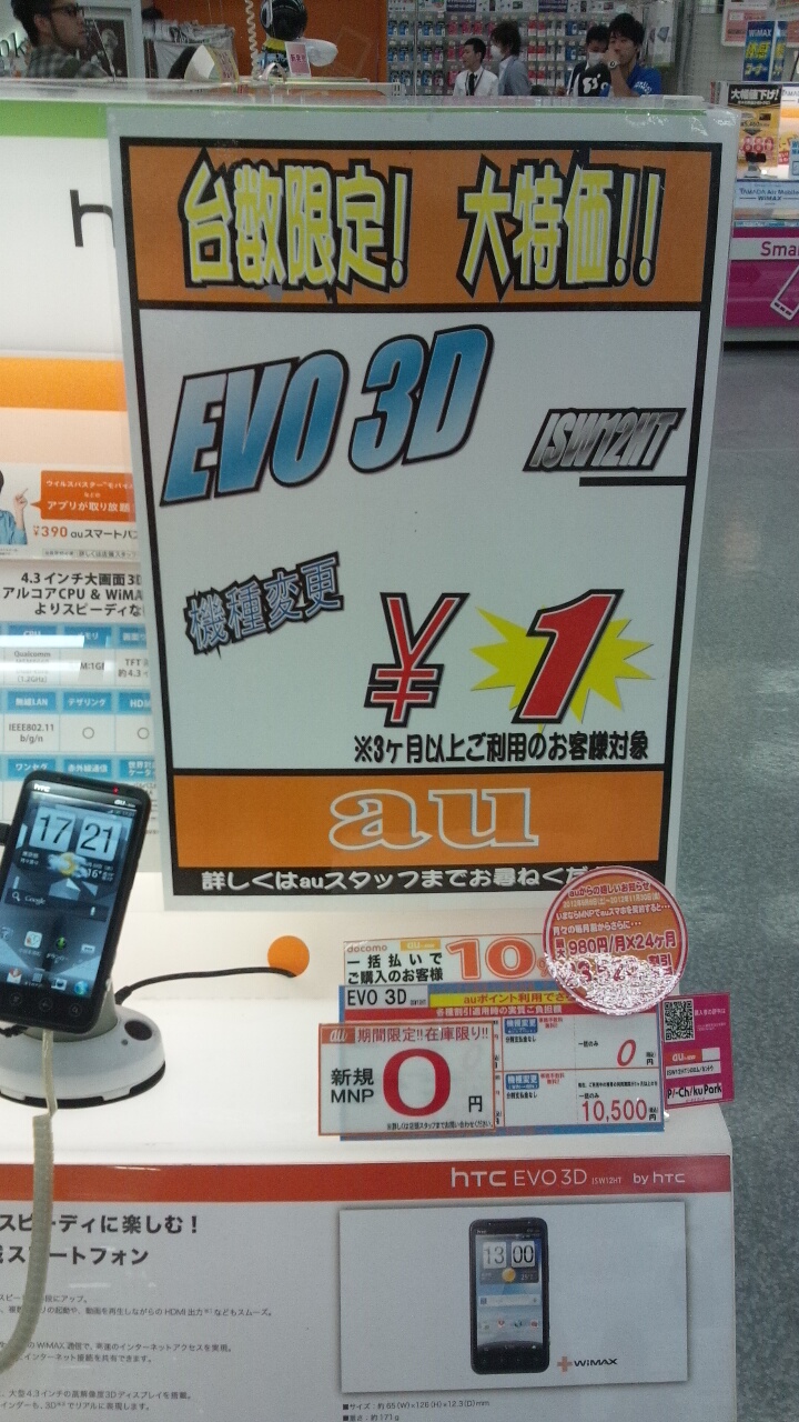 ヤマダ電機渋谷です。EVO3D(ISW12HT)が一括1円でした。条件は前機種3ヵ月以上とスマパス、有料コンテンツ3つと無料コンテンツ4つでした。パケ定は任意みたいです。有料コンテンツも30日無料のやつから選べたので費用がかかるのはスマパスとパケ定だけですね。月末なんでゴニョゴニョすればパケ定も日割りになるので、実質千円ぐらいで機種変更できますね。
