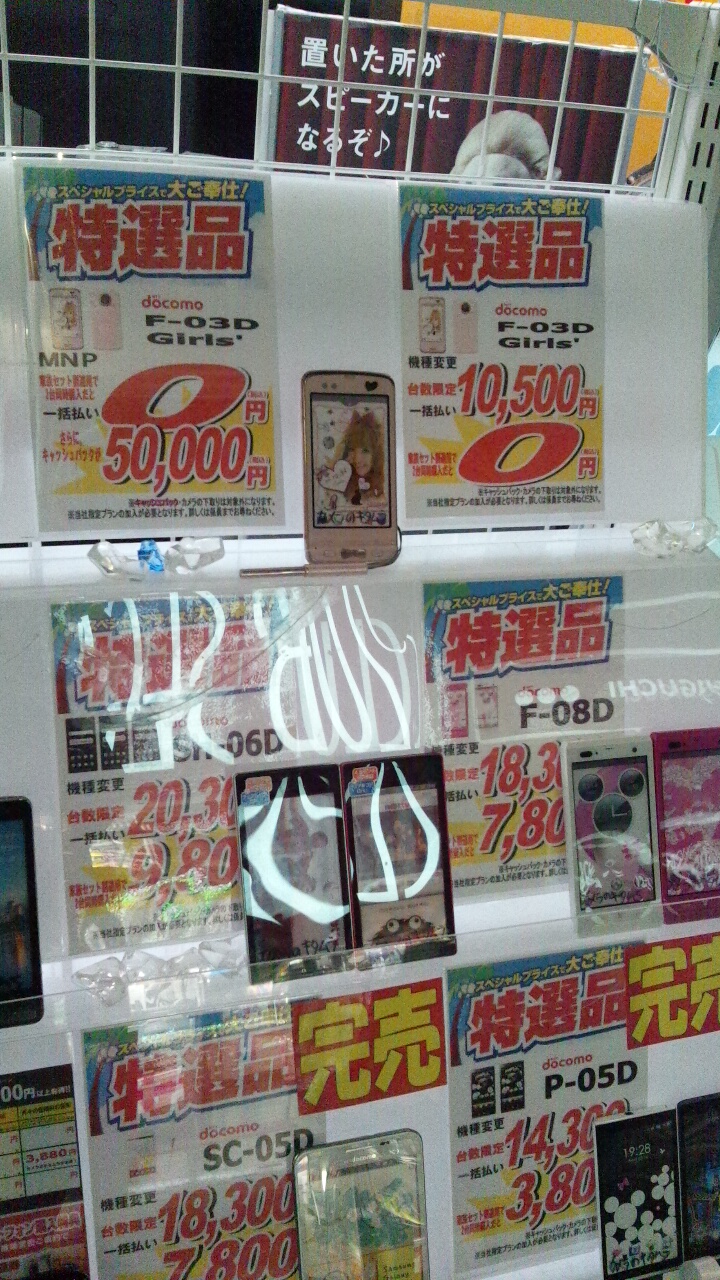 キタムラです。SC-05DとP-05Dは完売みたいです。SH-06D9800円、F-08D7800円、F-03D0円は在庫ありました。家族セット割で機種変更の値段です。