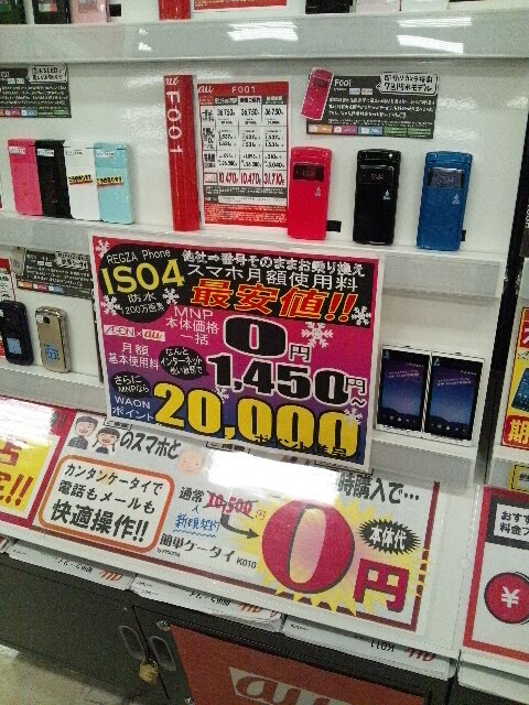 関西のイオン第三弾です。auのIS04です。去年にあれだけ安売りしてたのに、まだあったんですね。毎月割りが1450円もつくらしいです。毎月割りの額から考えるとFVじゃなくて無印のIS04でしょうか。端末は不具合満載らしいので売ってしまって、別のまともな端末を買いましょう。メイン回線を安く持ちたい人にお勧めです。WAONが20000円分もつくのでMNPに必要な手数料ぶんは賄えます